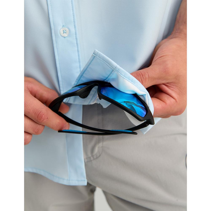 The Huk Tide Point short sleeve shirt provides 30+ UPF protection with mechanical stretch and quick-drying moisture-transport fabric designed for water and outdoor activities. Features include a mesh-backed chest pocket, perforated back panel, and interior eyeglass wipe for added functionality.