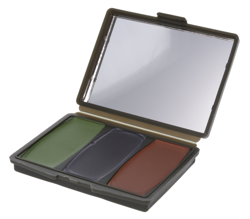 Pocket-size compact case contains three woodland camo makeup colors (mud brown, leaf green, and flat black) with a built-in mirror for application. The formula resists drying, cracking, and will not wash off with rain or perspiration. Removes easily with Camo-Off or soap and water.
