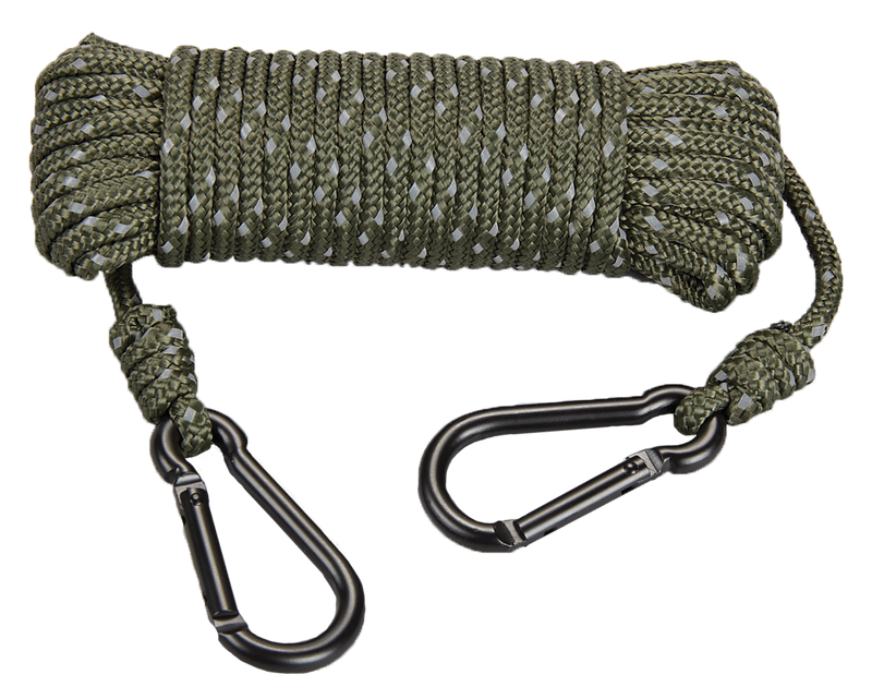 This 30-foot reflective rope in olive drab is designed for hunters who need reliable cordage for gear organization, tree stand setup, or general outdoor use. The reflective material enhances visibility in low-light conditions while maintaining a muted color suitable for hunting environments. The rope provides practical utility for securing equipment and gear in the field.