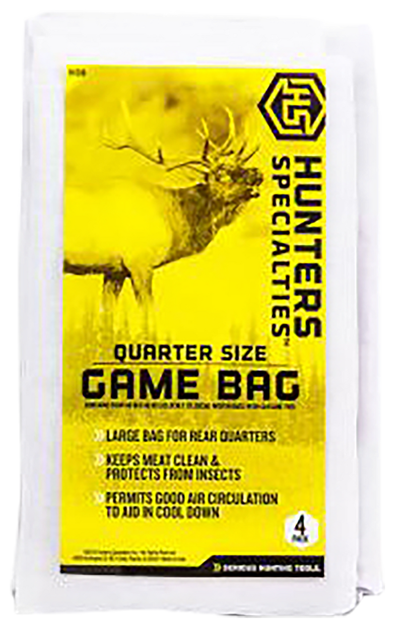 This 4-pack of quarter-size game bags measures 40" x 48" and is designed for field dressing and transporting game during hunts. The white bags feature practical dimensions (14.3" L x 7.5" W x 2.6" H) making them suitable for medium-sized game processing and storage. Hunters Specialties game bags are standard hunting field accessories for meat preservation and organization.