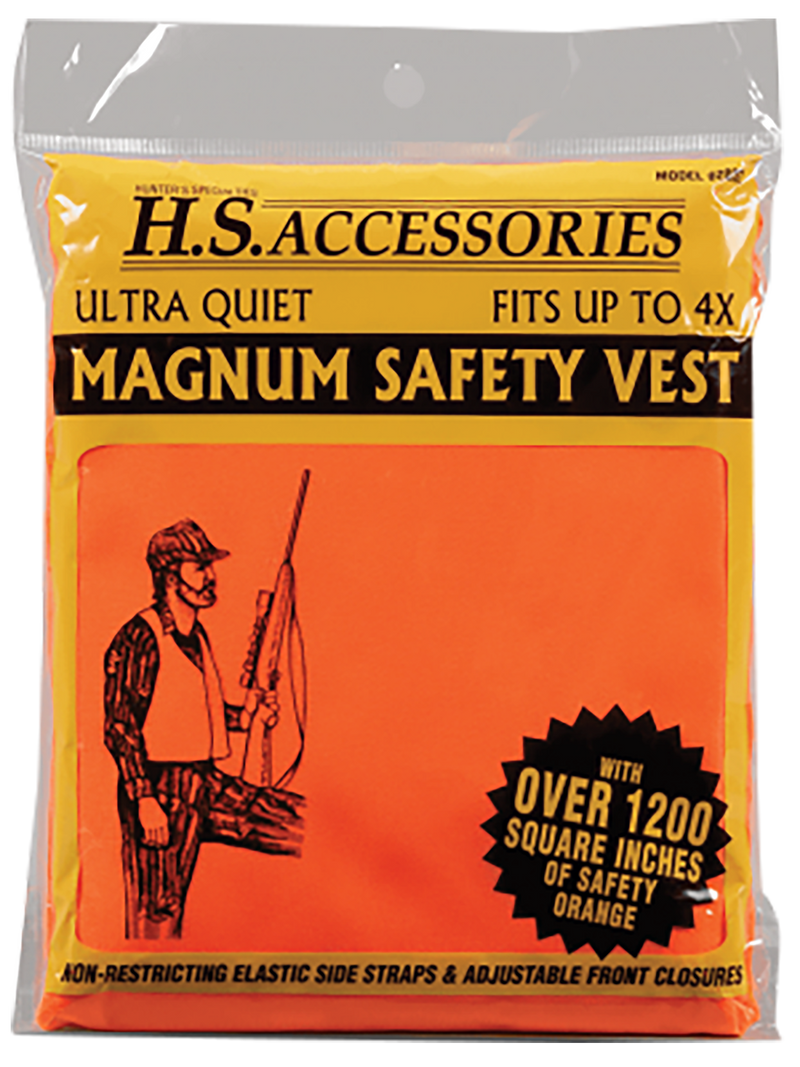 This blaze orange safety vest provides over 1200 square inches of high-visibility safety orange material to keep hunters visible in the field. It features an adjustable front closure and non-restricting elastic side straps, designed to fit hunters up to size 4XL. The vest is constructed with a super quiet material to minimize noise while hunting.