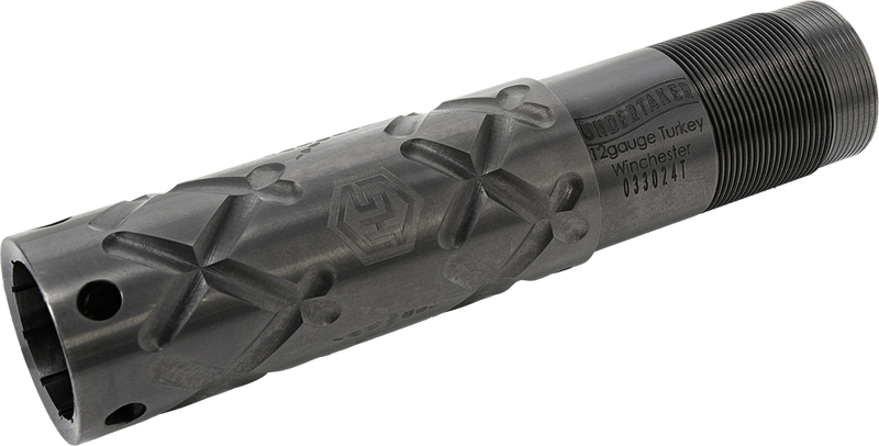 The Undertaker Pro is a high-performance turkey choke tube designed for 12 gauge Winchester and Browning Invector shotguns. It features unique internal groove technology that separates pellets from the wad while straight rifling prevents wad spinning, delivering dense, even patterns and maximum kinetic energy at extended ranges. This choke tube installs directly into compatible shotgun barrels and is optimized for turkey hunting applications.