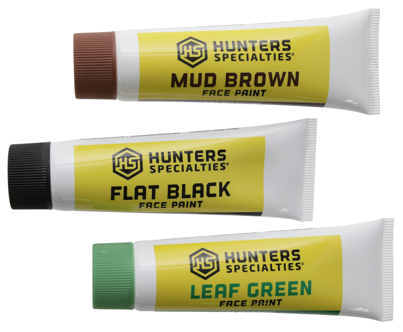 This camo face paint kit includes three 1 oz. tubes of creme makeup in mud brown, flat black, and leaf green colors designed to blend into natural hunting environments. The easy-to-use formulation is an essential addition to any hunter's gear for effective camouflage. Kit dimensions are approximately 7.25" x 4.5" x 1".