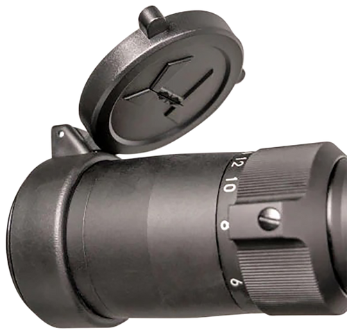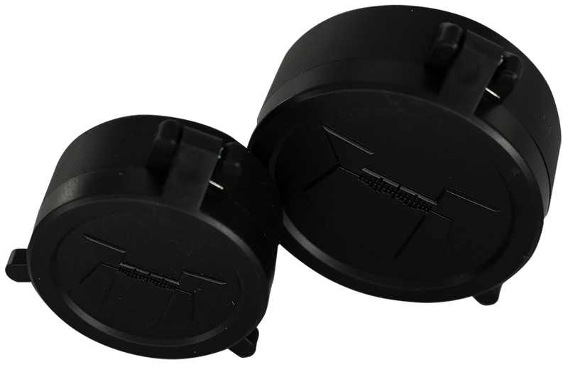 These flip-up lens caps are designed for Huskemaw Optics Blue Diamond 4-16x42mm riflescopes. Made from durable black rubber material, they protect the 42mm objective lens from dust and debris during storage and transport.