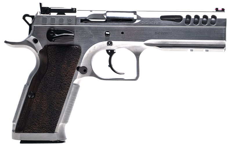 The Tanfoglio Stock Master is a DA/SA semi-automatic pistol chambered in 9mm Luger with a 4.75" hard chrome bull barrel and 17+1 capacity. It features adjustable fiber optic front and SuperSight rear sights, ambidextrous extended safety, and serrated ported slide. Designed for Production Division competition with a robust steel frame and available wood or aluminum grips.