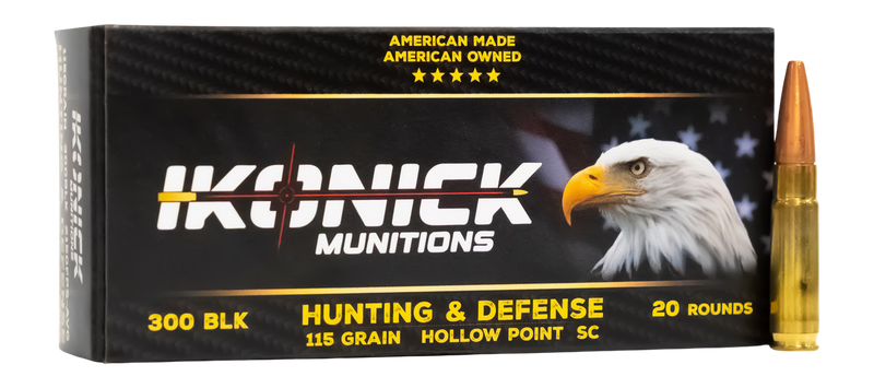 IKONICK 300 Blackout ammunition loaded with 115-grain hollow point projectiles. This centerfire rifle round is packaged in a 20-round box format, designed for use in .300 Blackout rifles. The hollow point construction provides expansion characteristics suitable for hunting and sport shooting applications.