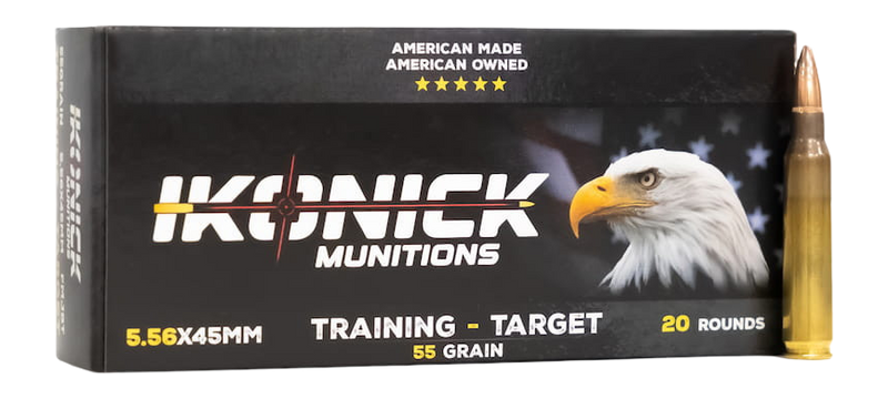 IKONICK USA 5.56 NATO centerfire rifle ammunition loaded with 55-grain projectiles. Packaged in 20-round boxes for convenient storage and transport. Suitable for AR-15 rifles and other 5.56 NATO chambered firearms.