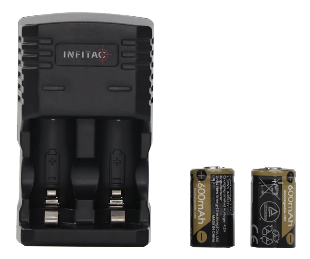 The INFITAC BC01 is a 4.2V dual-channel charger designed for 3.7V CR2 and 16340 rechargeable lithium batteries. Each channel independently monitors charging status, allowing simultaneous charging of one or two batteries of mixed types with clear LED indicators (red for charging, solid green for complete, flashing red for errors). This versatile charger provides flexible power solutions for tactical lighting and accessory applications.