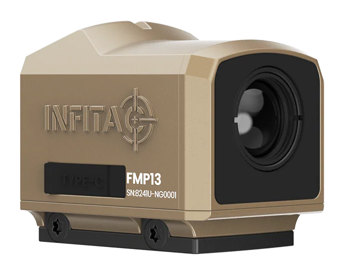 The Infitac Fast Mini FMP13 is a compact thermal pistol sight featuring a 256×192 resolution sensor operating at 60 Hz with an F1.0 13mm lens and 1.4-inch 360×300 display. IP67 waterproof rated and designed for up to 1200g recoil, it is powered by a CR2 battery providing up to 5 hours of runtime in an ultra-compact and lightweight package.