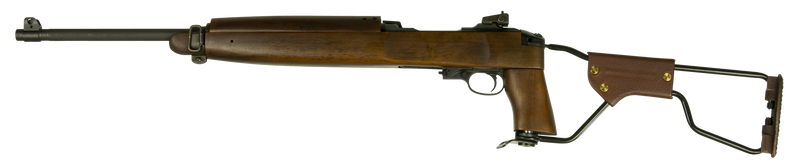 Semi-automatic rifle chambered in .30 Carbine with an 18" barrel and 15+1 round capacity. Features a folding wire paratrooper stock with low wood walnut furniture, adjustable rear sights, and type 2 barrel band, modeled after the 1944 M1A1 design. Weighs 5.19 lbs and manufactured in the USA.