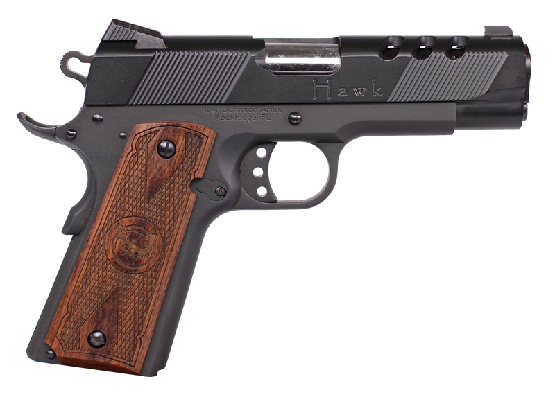 The Iver Johnson Hawk 45P is a semi-automatic pistol chambered in 45 ACP with a 4.25" barrel and commander-length ported slide for reduced recoil. This blue-finished handgun features classic 1911-style ergonomics and is designed for reliable performance in a compact defensive platform.