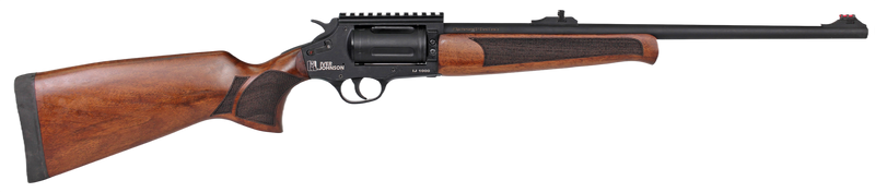 The Iver Johnson IJ1000 is a .410 gauge revolver shotgun with a 20" barrel and 5-round capacity. Features a matte black chrome finish, walnut fixed stock, Picatinny rail on receiver, and fiber optic front/blade rear sights. Weighs 5.15 lbs with a manual safety and DAO trigger.