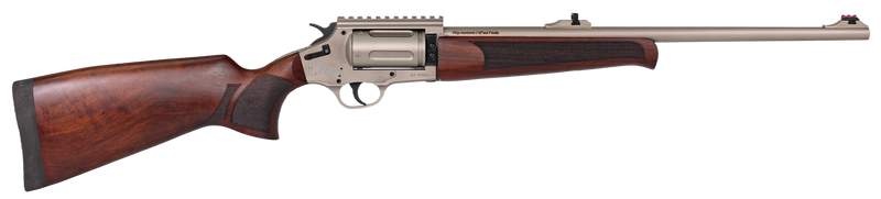 The Iver Johnson 1000 is a 410 gauge revolver shotgun with a 20" barrel and 5-round capacity, featuring a double-action-only trigger and manual safety. The receiver includes a Picatinny rail for optic mounting, fiber optic front and blade rear sights, and a fixed walnut stock. This 5.15 lb specialty shotgun combines tactical features with classic wood furniture.