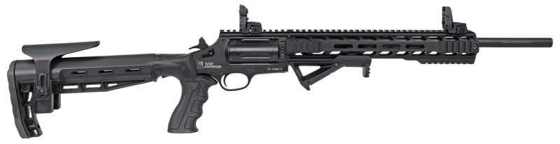 The Iver Johnson IJ1000 is a .410 gauge revolver shotgun with an 18" matte black barrel and 5-round capacity, featuring a manual safety and fiber optic front/blade rear sights. It includes a Picatinny rail on the receiver for accessory mounting and a synthetic black fixed stock. This 5.15 lb tactical shotgun offers a compact 38.5" overall length suitable for home defense and sport shooting.