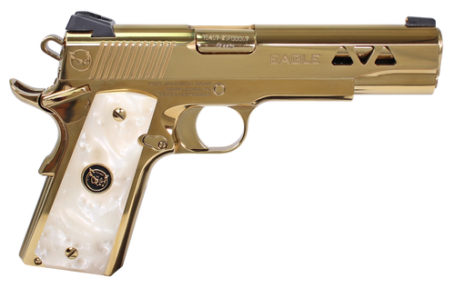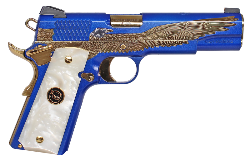 Semi-automatic 1911-style pistol chambered in 45 ACP with a 5" barrel and 8+1 round capacity. Features a royal blue finish, white pearlized grips with logo medallion, serrated slide, and beavertail grip/thumb safety. Dimensions: 11.5"L x 8.5"W x 2.7"H.