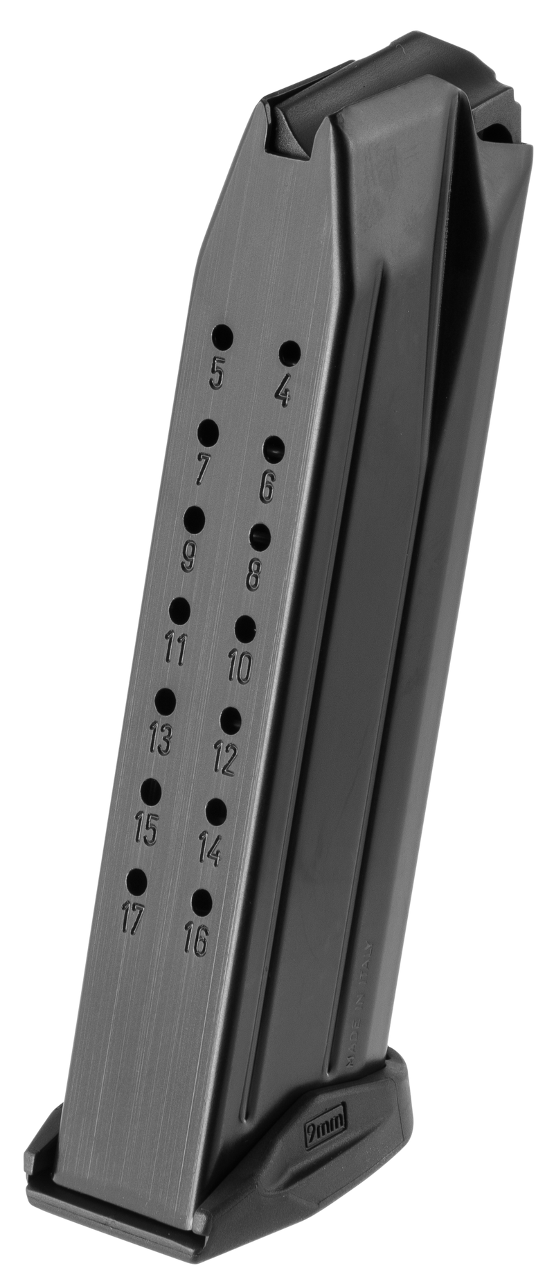Steel construction handgun magazine chambered in 9mm Luger with 17-round capacity, designed for the IWI Masada pistol. Features a polymer baseplate and black oxide finish. Made in Italy.