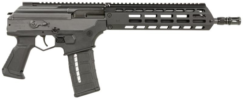 Semi-automatic pistol chambered in 5.56 NATO/.223 Rem with a 13" steel barrel and 30-round capacity. Features a free-float M-LOK handguard, Picatinny rail receiver, and black polymer grip for tactical modularity.