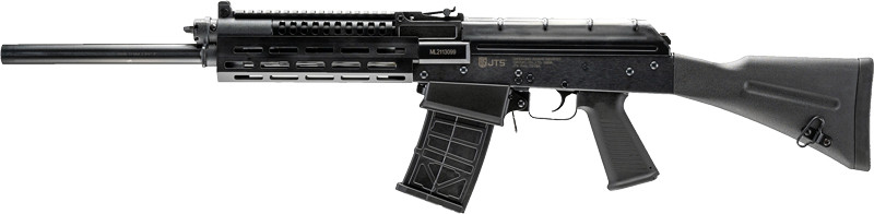 The JTS M12AK-T1A is a 12 gauge semi-automatic shotgun with an 18.7" chrome-lined barrel featuring Rem-Choke compatibility. It includes a four-position adjustable gas system for shooting both 2.75" and 3" shells, M-LOK polymer forearm with picatinny rail, and ships with two 5-round detachable magazines.