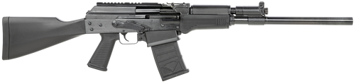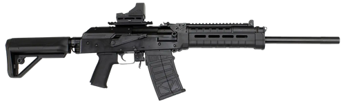 The JTS M12AK-T1A is a 12-gauge semi-automatic shotgun with an 18.7" chrome-lined barrel and 3" chamber, chambered to fire 2.75" and 3" shells. It features a 4-position adjustable gas system, M-LOK compatible forearm with Picatinny rail, fits Remington choke tubes, and ships with two 5-round magazines. The Olive Drab Green synthetic forearm includes sling attachment points.
