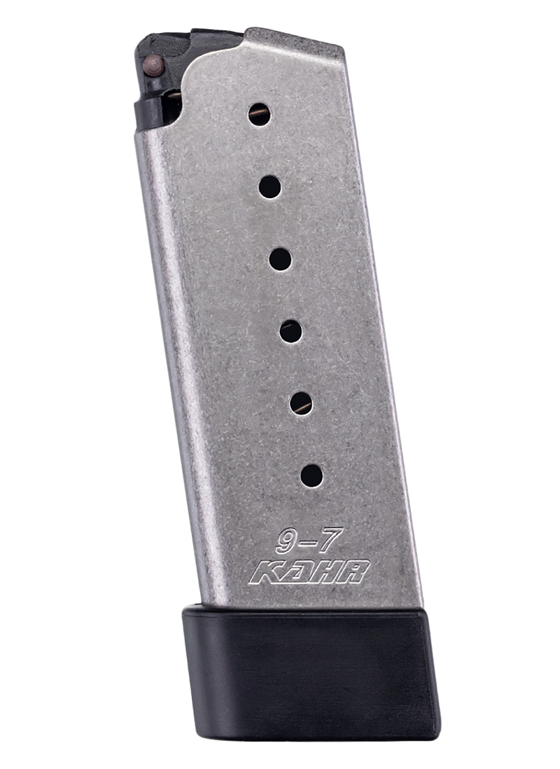 This is a 7-round 9mm Luger magazine for Kahr CM/PM/MK/Covert series pistols. Features stainless steel construction with a grip extension for improved handling and capacity. Compatible with Kahr PM, CM, and MK model handguns.
