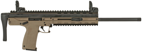 The Kel-Tec CMR-30 is a semi-automatic carbine chambered in 22 WMR with a 16" threaded barrel and 30+1 round capacity. Features include Magpul MBUS adjustable sights, ambidextrous safety, collapsible green polymer/aluminum stock, and Picatinny rails on top and bottom. Weighs 3.8 lbs with an overall length of 22.7" collapsed to 30.6" extended.