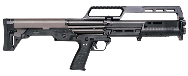 The KS7 Gen 2 is a lightweight 12-gauge pump-action bullpup shotgun with a 3" chamber and 6+1 capacity, featuring an 18.5" barrel and measuring just over 26" in overall length while weighing approximately 5.9-6.8 lbs. It incorporates a five-slot Picatinny-style rail on the forend for accessory attachment, fiber optic front sight, and a black synthetic stock with vertical pistol grip. Downward ejection design and cylinder bore choke.
