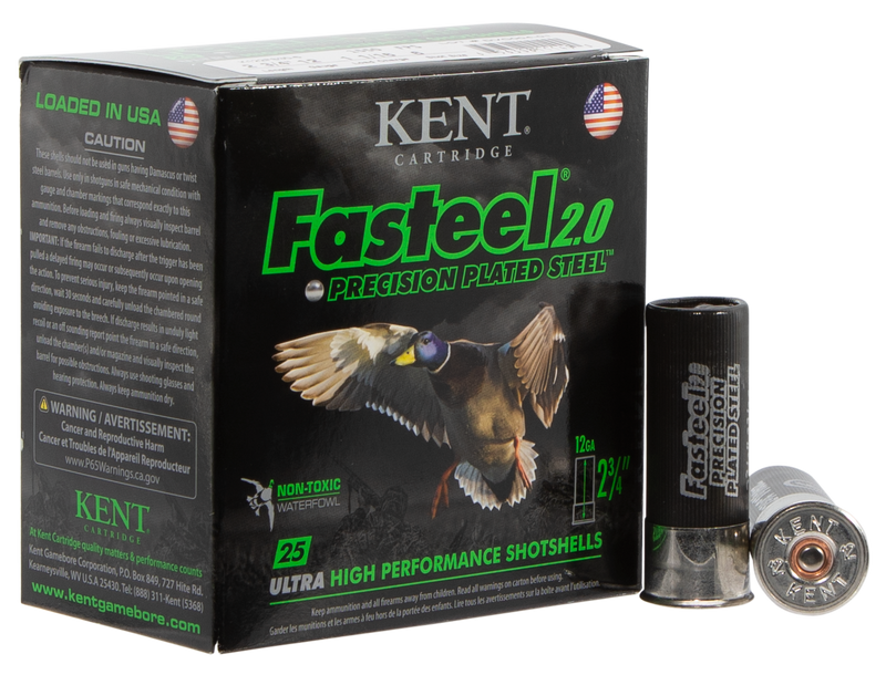 Kent Cartridge Fasteel 2.0 shotshells are 12 gauge steel shot loads designed for waterfowl hunting. These 2.75" shells contain 1 1/16 oz of #6 shot and deliver 1550 fps muzzle velocity, providing reliable performance for duck and goose hunting.