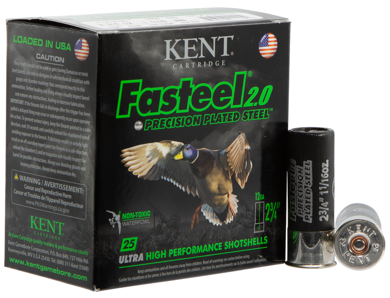Kent Fasteel 2.0 12 Gauge 2.75" shotshells loaded with 1 1/16 oz of BB steel shot at 1550 fps muzzle velocity. Designed specifically for waterfowl hunting, these precision steel shotshells deliver reliable performance for duck and goose hunting. Steel casing construction makes them suitable for use in most modern shotguns.