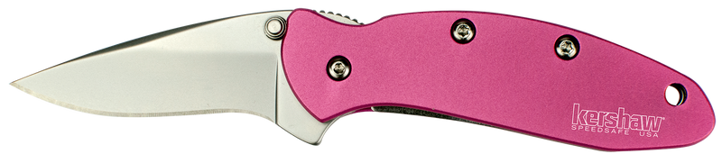The Kershaw Chive is a compact everyday carry folder featuring a 1.9" drop point blade made from 420HC stainless steel with a plain edge. It has a pink anodized aluminum handle, SpeedSafe assisted opening mechanism, and includes a pocket clip for convenient carry.