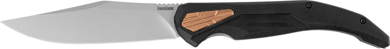 The Kershaw Strata is a 4" folding cleaver knife featuring a stonewashed D2 steel blade with a plain edge and flipper opening mechanism. The handle combines bead blasted stainless steel and black G10 with a copper insert, resulting in a durable 4 oz knife with a 9.3" overall length.