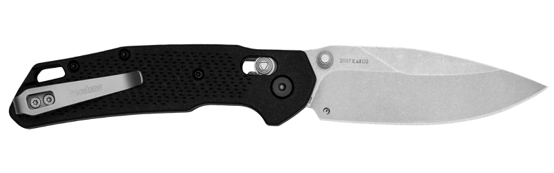 The Kershaw Heist is a mid-size folding knife featuring a 3.2" D2 steel blade with a stonewashed finish and plain edge. It includes a glass-filled nylon handle with textured grip, manual thumb stud opening, DuraLock blade lockup, and a deep carry pocket clip for everyday carry or work tasks.