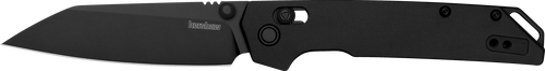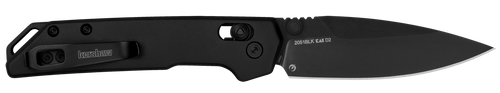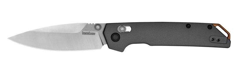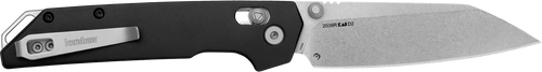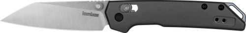 The Kershaw Iridium is a full-size folding knife featuring a 3.4" D2 steel spear point blade with a stonewashed finish and plain edge. The gray anodized aluminum handle includes a thumb stud for smooth KVT ball bearing deployment, a deep carry pocket clip, and DuraLock blade lock technology suitable for everyday cutting tasks.
