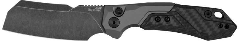 The Kershaw Launch 14 is an automatic folding knife featuring a 3.38" CPM 154 stainless steel cleaver blade with a plain edge and black oxide blackwash finish. The handle is constructed from black anodized aluminum and carbon fiber with a finger choil for enhanced control during heavy work tasks, and it operates via a push button lock mechanism. Overall length is 7.75" with a weight of 3.2 oz, making it a compact and practical everyday carry option.