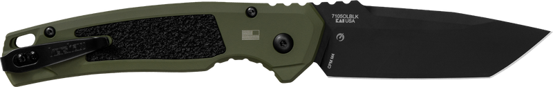 The Kershaw Launch 16 is a push-button automatic folding knife featuring a 3.45" CPM M4 steel tanto blade with plain edge and black Cerakote finish. The olive Cerakote aluminum handle includes black oxide hardware, Trac-Tec grip inserts with jimping and finger choil for secure handling. Weighing 4.1 oz with an overall length of 8.4", this knife is designed for versatile cutting tasks requiring high edge retention and durability.