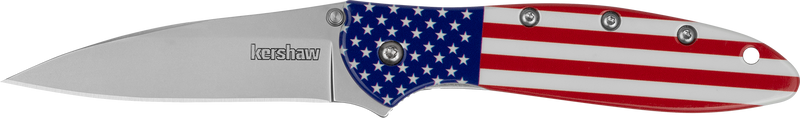 The Kershaw Leek is a 3-inch drop point folding knife featuring a 14C28N stainless steel blade with a bead blasted finish and an American flag-themed aluminum handle. It includes assisted opening via flipper mechanism, liner lock, and a pocket clip for everyday carry. Manufactured in the USA and designed by Ken Onion, this slim EDC knife weighs 2.6 oz with a 7-inch overall length when open.