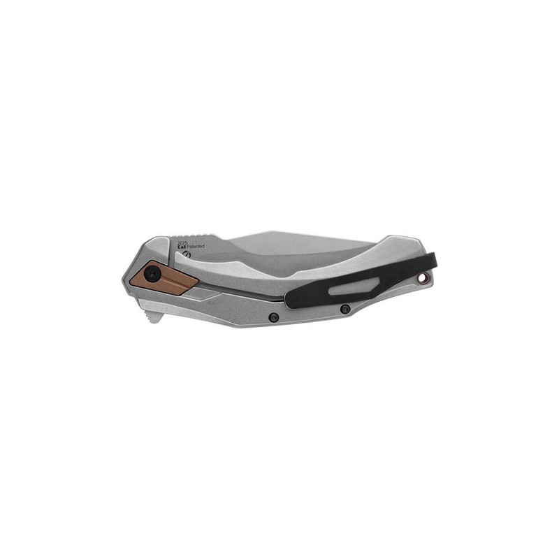 The Payout is a larger assisted-opening folding knife featuring a 3.5-inch D2 steel drop point blade with a distinctive top swedge design. The handle combines machined stainless steel and black G10 scales with copper-anodized accents and a frame lock mechanism, weighing 5.3 oz overall.