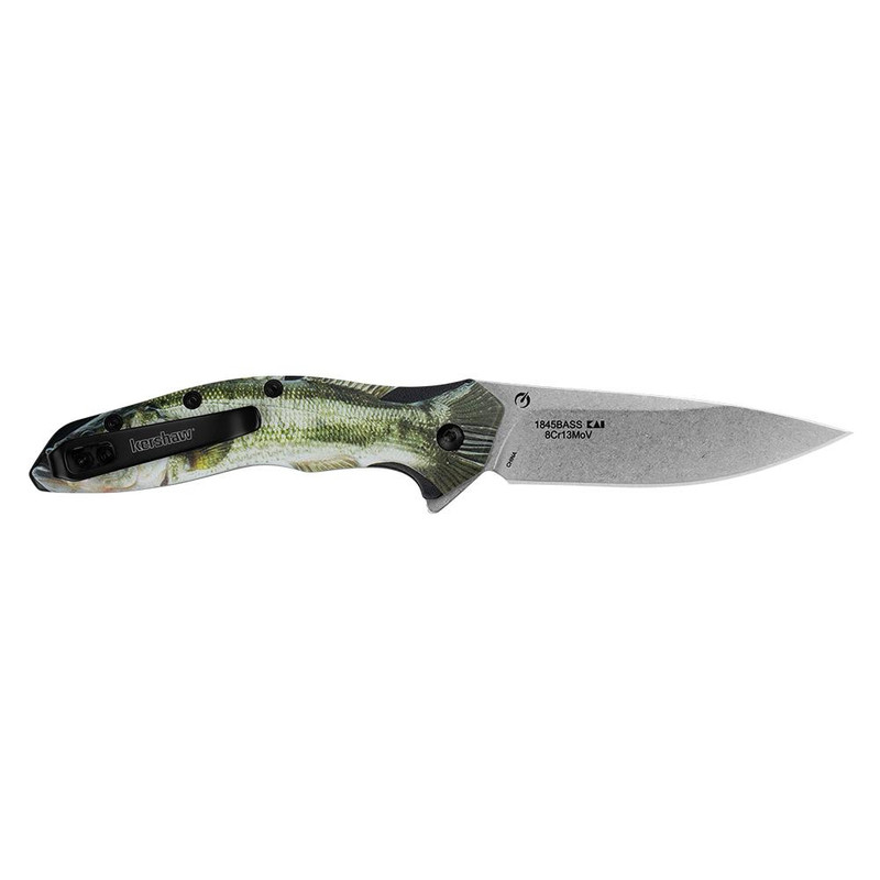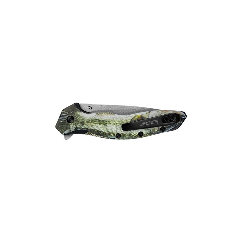 The Kershaw Shoreline Bass is a 3" drop point folding knife featuring assisted opening technology and a 8Cr13MoV stainless steel blade with stonewash finish. The aluminum handle is 3D-contoured with a detailed bass design and includes a flipper and tip-up pocket clip for versatile carry options. This everyday carry knife weighs 3.2 oz and measures 7.15" overall length with a liner lock mechanism.