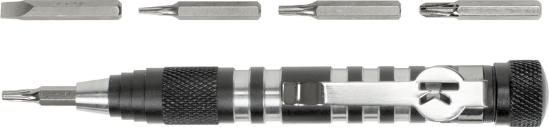 The TX-Tool is a compact multi-tool designed specifically for Kershaw knife owners, featuring five interchangeable bits including T-6, T-8, and T-10 Torx bits plus slotted and Phillips screwdriver bits for adjustments and maintenance. The 4.8" aluminum tool weighs 1.1 oz and includes a magnetic bit driver tip for easy bit changes and storage. Ideal for tightening pocket clips, adjusting screws, and maintaining Kershaw and Kershaw-Emerson folding knives.