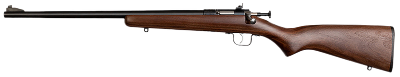 Left-hand bolt-action single-shot rifle chambered in .22 LR with a 16.13" blued barrel and American walnut stock. Features fixed front sight with adjustable rear peep sight, firing pin safety, and EZ Loader feed ramp. Weighs 2.6 lbs with an overall length of 30", designed for youth shooters with an 11.625" length of pull.
