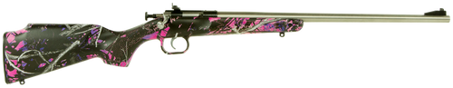 Single-shot bolt-action rifle chambered in .22 LR with a 16.12" blued barrel and fixed front/adjustable rear peep sights. Features a Muddy Girl hydro-dipped synthetic stock with 11.5" length of pull, rebounding firing pin safety, and drilled/tapped for optics. Weighs 3 lbs and designed as a youth/beginner rifle.