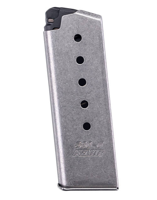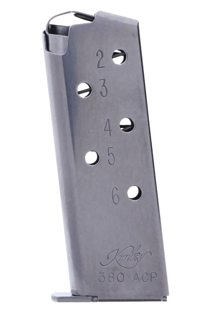 This stainless steel magazine is designed for the Kimber Micro .380 ACP pistol and holds 6 rounds. The silver stainless finish provides corrosion resistance and durability for reliable firearm operation.