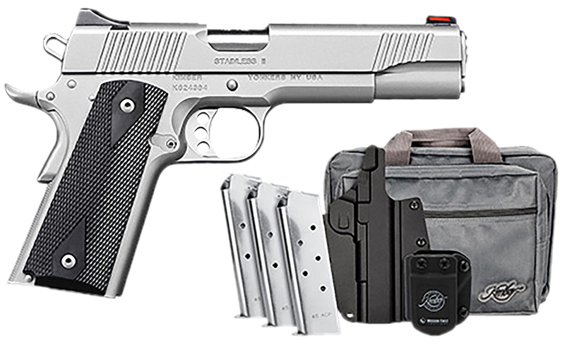 The Kimber Stainless II is a full-size 1911-style semi-automatic pistol chambered in .45 ACP with a 5" barrel and 7+1 capacity. Built with a stainless steel frame and slide in satin silver finish, it features front serrations, fiber optic front sight, adjustable rear sight, and synthetic grips. This Club Bundle includes 3 magazines, holster, mag carrier, and range bag, and is California-compliant.