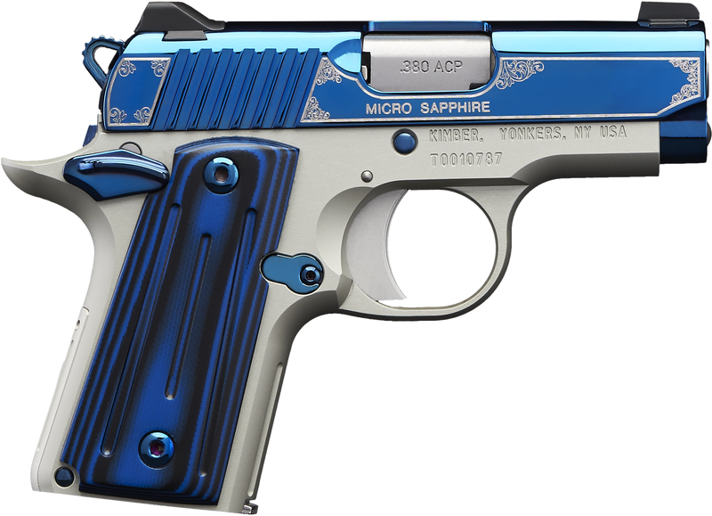 The Kimber Micro Sapphire is a single-action semi-automatic pistol chambered in 380 ACP with a 2.75" barrel and 7+1 capacity. It features a bright blue PVD-coated slide with intricate scroll engraving, satin silver aluminum frame, and 3-dot tritium night sights. Weighing 13.4 oz and measuring 5.6" overall length, this compact pistol is designed for concealed carry with ball-milled G-10 grips.