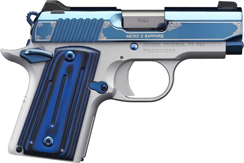 The Kimber Micro 9 Sapphire is a single-action, semi-automatic sub-compact pistol chambered in 9mm Luger with a 3.15" match-grade barrel and 7+1 round capacity. It features a distinctive bright blue PVD-coated stainless steel slide with scroll engraving, satin silver aluminum frame, G10 grips, tritium night sights, ambidextrous manual safety, and full-length guide rod. This sub-compact pistol weighs 15.6 oz and has an overall length of 6.1 inches, making it ideal for concealed carry.