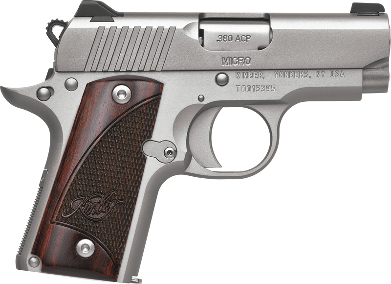 The Kimber Micro Stainless Rosewood NS is a single-action semi-automatic pistol chambered in .380 ACP with a 2.75" stainless match-grade barrel and 7+1 round capacity. It features a satin silver serrated stainless steel slide, satin silver aluminum frame with extended beavertail, rosewood grips, and 3-dot tritium night sights. Weighing 13.4 oz with an overall length of 5.6", this sub-compact pistol offers mild recoil and smooth 1911-style operation.