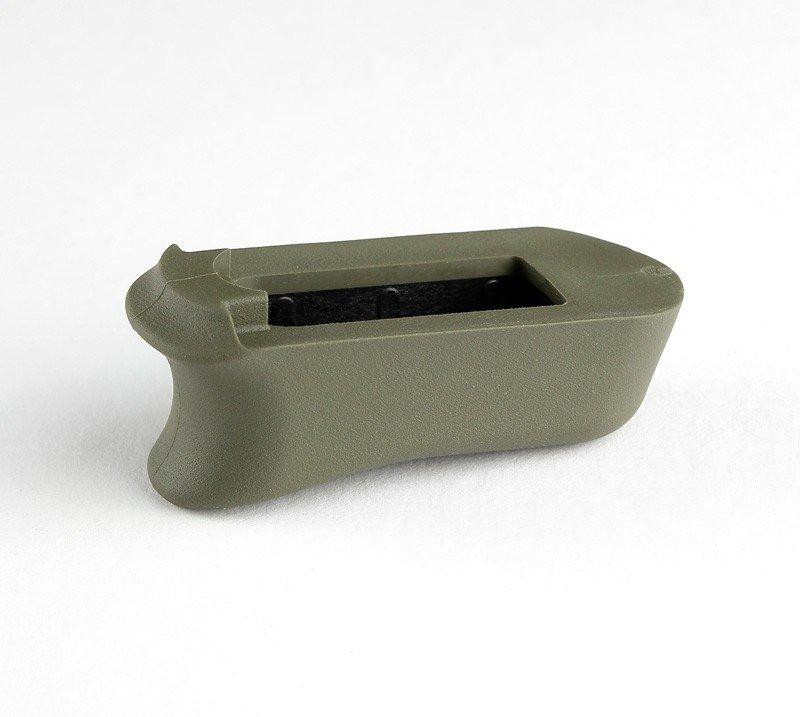 Extended rubber base pad designed for Kimber Micro 9 9mm handgun magazines. Provides improved grip and ergonomics while extending magazine capacity. OD Green color with durable rubber construction.