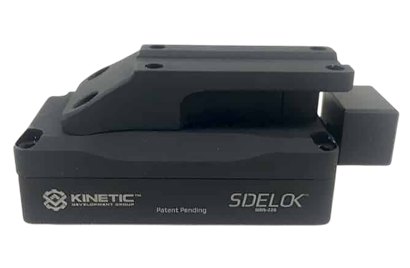 The KDG Sidelock is a black aluminum mounting solution designed for Trijicon MRO, MRO Patrol, and Burris RT-1X optics. This lower 1/3 co-witness mount provides secure attachment with compact dimensions measuring 7.5" length, 5.7" width, and 1.4" height.