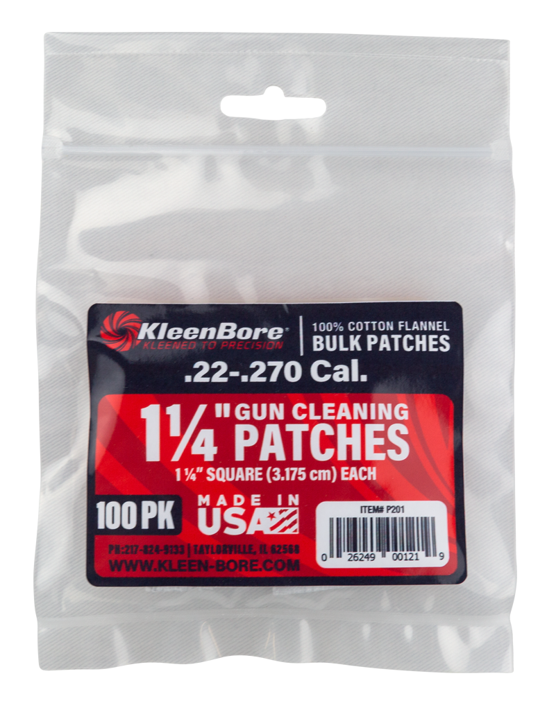 Kleen-Bore Super Shooter cleaning patches are precision-cut 1.25" square patches made from 100% cotton flannel, designed for use with .22 to .270 caliber firearms. These patches provide maximum absorbency and bore protection when used with Kleen-Bore jags. Each pack contains 100 patches and is made in the USA.