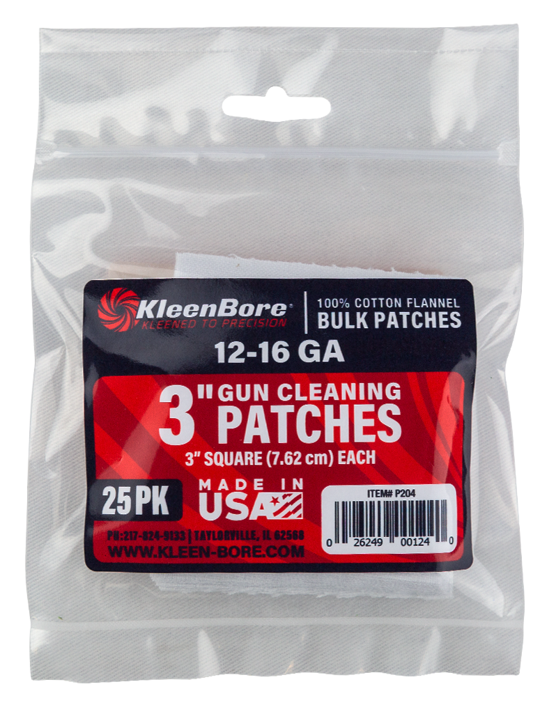 100% cotton flannel patches designed for cleaning 12-16 gauge shotguns, with precision cutting for proper fit and maximum absorbency. These patches provide bore protection and are made in the USA for use with Kleen-Bore jags. Pack contains 25 patches.