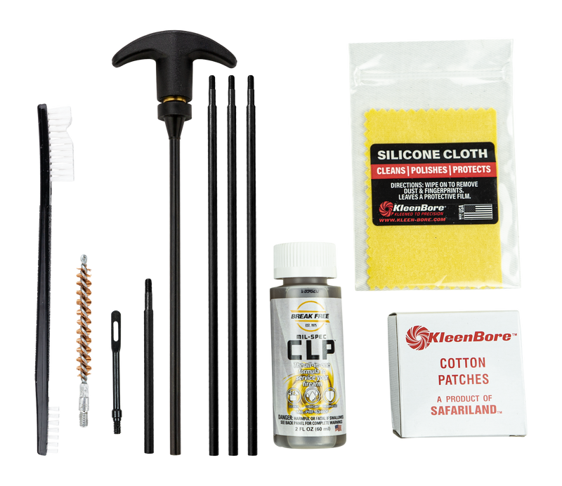 This classic rifle cleaning kit is designed for .264, .270, and 7mm caliber rifles. It includes a 30" rigid black steel cleaning rod with swivel handle, phosphor bronze bore brush, nylon bristle brush, black steel patch holder, muzzle guard, rod accessory adaptor, silicone cloth, cotton patches, and 2 oz. of BreakFree CLP lubricant.